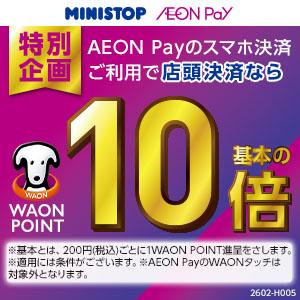 ミニストップモバイルオーダー(WEB版・アプリ版)でAEON Payのスマホ決済をご利用すると、WAON POINTを基本の20倍進呈。 ※店頭でのAEON Payスマホ決済ご利用分は対象外です。 ※適用には条件がございます。