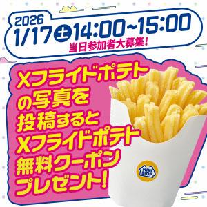 指定の時間内にXでみんなのXフライドポテトの写真を投稿してね!参加者全員にXフライドポテト無料クーポンプレゼント!