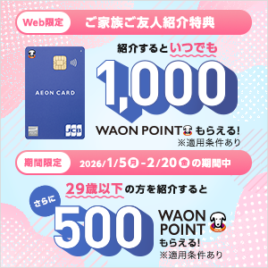 イオンマークのカードをお持ちの方が、ご家族・ご友人にイオンカードを紹介すると1,000WAON POINTを進呈します。