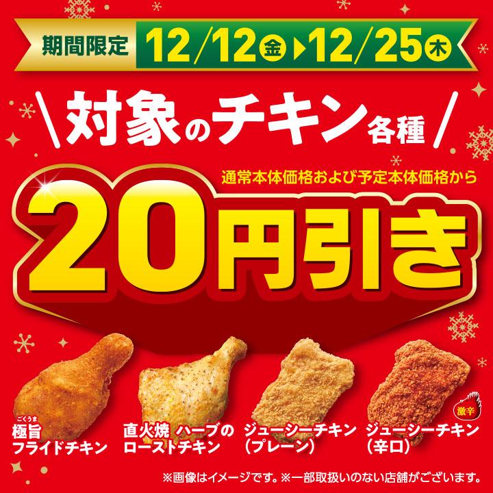 対象のチキン各種が、通常本体価格および予定本体価格から20円引き!この機会にぜひお試しください!【対象商品】