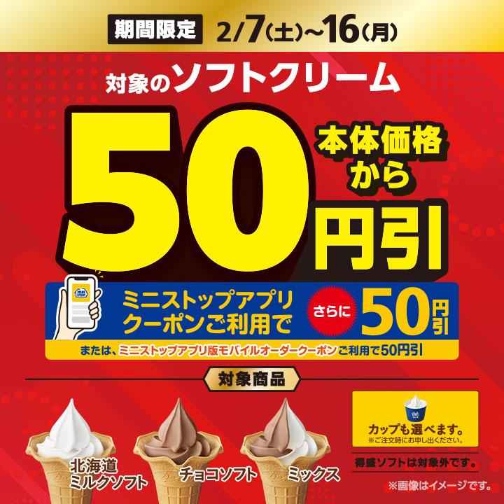 対象のソフトクリームが本体価格から50円引き!ミニストップアプリ・ミニストップアプリ版モバイルオーダークーポンご利用でさらに50円引き!この機会にぜひお試しください!