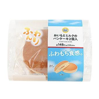 - ふわふわでもちっとした食感が特徴の食べ応えのあるパンケーキです。紅はるかを使用した芋あんと北海道産牛乳入りのミルクホイップをサンドしました。