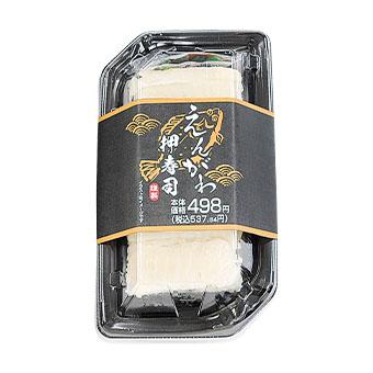 - 脂がのった濃厚な味わいのえんがわを使用した押寿司です。酢飯とネタの間に青しそ高菜を挟み、えんがわの旨みを引き立てました。
