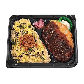- 濃厚かつ甘口に仕上げた味噌たれをたっぷりかけた、ロースとんかつのお弁当です。錦糸卵と鶏そぼろをトッピングした、彩り豊かな醤油ご飯を合わせました。