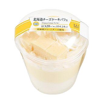 - 北海道クリームチーズを使用したパフェです。ミルクムースにスポンジを敷き、チーズムースを重ねてチーズホイップクリームを絞り、角切りチーズケーキとアーモンドスライスをのせました。