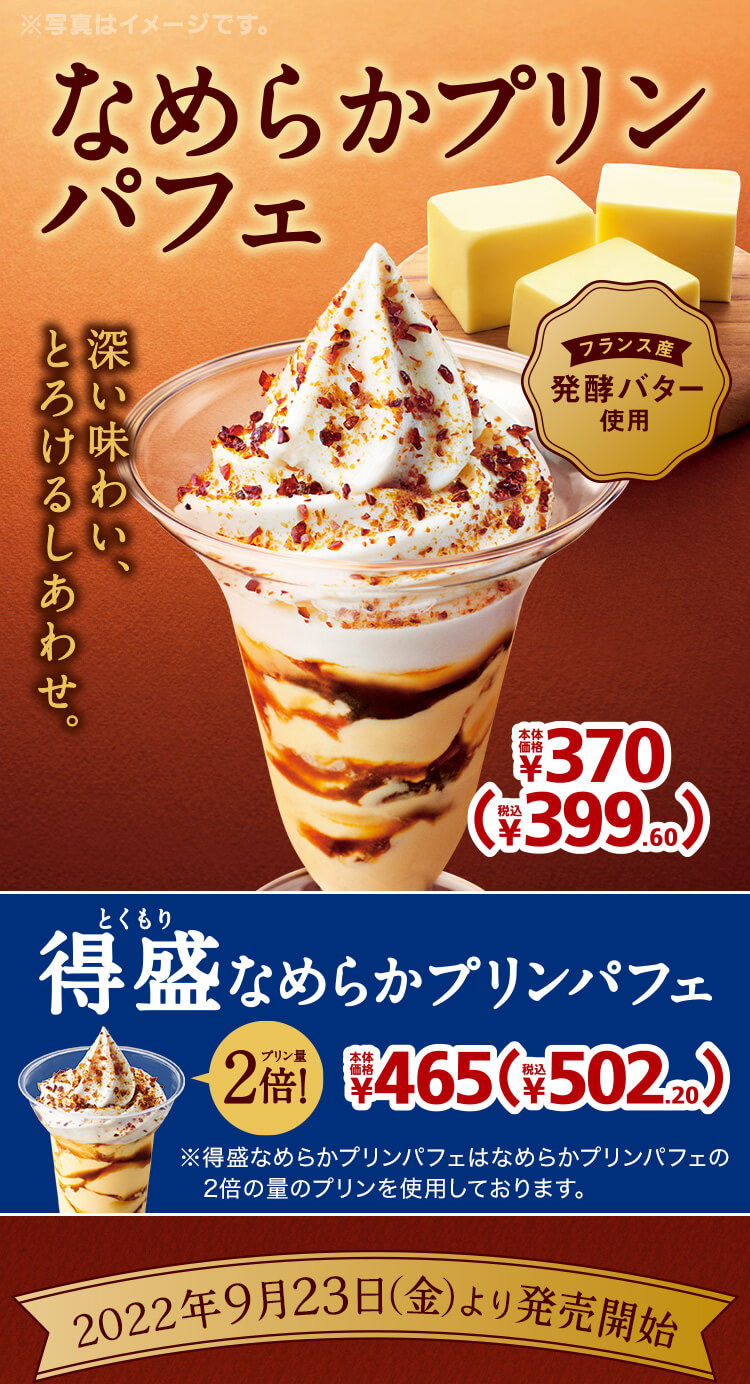 なめらかプリンパフェ 本体価格370円 税込399.60円 得盛なめらかプリンパフェ 本体価格465円 税込502.20円 2022年9月23(金)より発売開始※販売は終了しました。なめらかプリンパフェ 本体価格370円 税込399.60円 得盛なめらかプリンパフェ 本体価格465円 税込502.20円 2022年9月23(金)より発売開始※販売は終了しました。