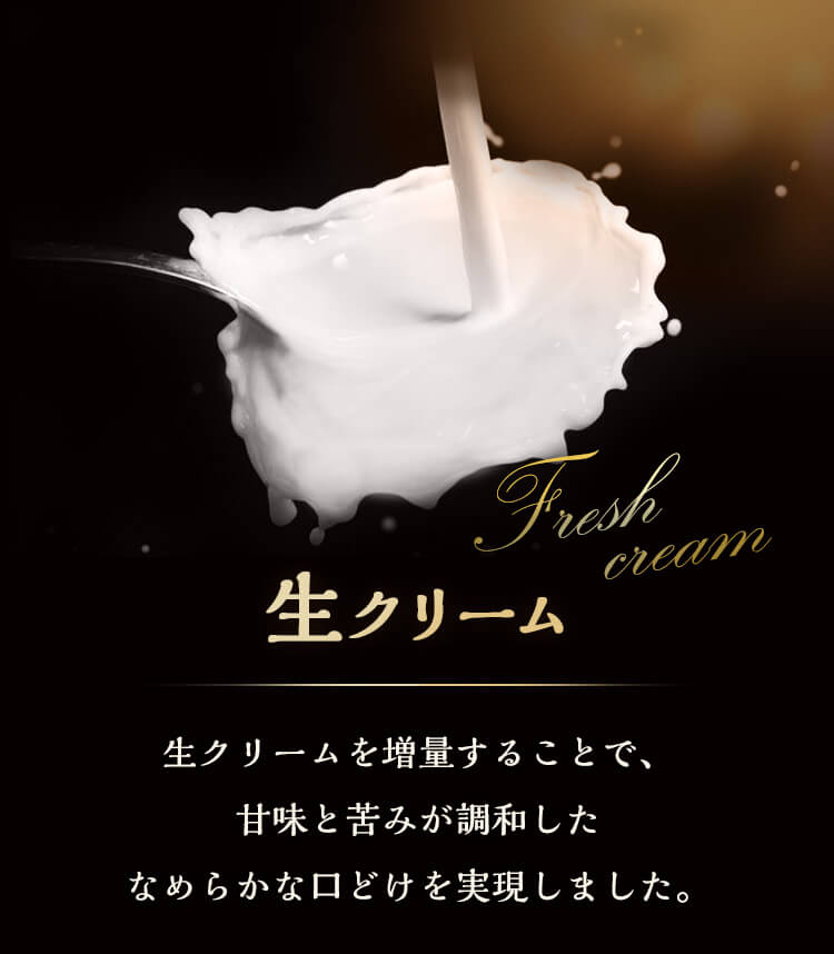 • 生クリーム 生クリームを増量することで、甘味と苦みが調和したなめらかな口どけを実現しました。生クリーム 生クリームを増量することで、甘味と苦みが調和したなめらかな口どけを実現しました。