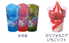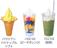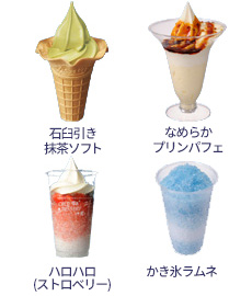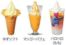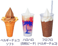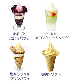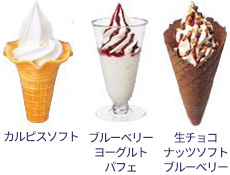 ソフトクリームバニラ、ブルーベリーソフト、カリフォルニアいちごソフト(カップ)、チョコナッツソフト(カップ)