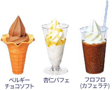バニラ、いちごミルクソフト・ミックス、カスタードプリンソフト・ミックス、クレームブリュレソフト・ミックス、マンゴーソフト・ミックス、ベルギーチョコソフト・ミックス
