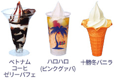 練乳いちごパフェ、ダブルベリーパフェ、マンゴーパフェ、アップルマンゴーパフェ、ベトナムコーヒーゼリーパフェ、パイナップルパフェ、白桃ピーチパフェ、ベルギーチョコケーキパフェ、白玉いちごぜんざいパフェ