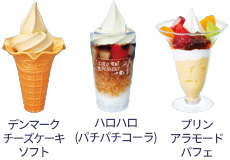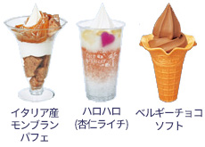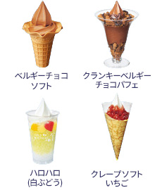 フォンダンショコラソフト、いちごヨーグルトパフェ、アップルマンゴーパフェ、クラッシュコーヒーゼリーパフェ、白桃ヨーグルトパフェ、3種のトロピカルフルーツパフェ、ベルギーチョコパフェ、パステルなめらかプリンパフェ