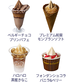チョコクッキーソフト、プリンソフト、和風くろみつソフト、生チョコソフト、さつまいものモンブランソフト、チョコバナナソフト
